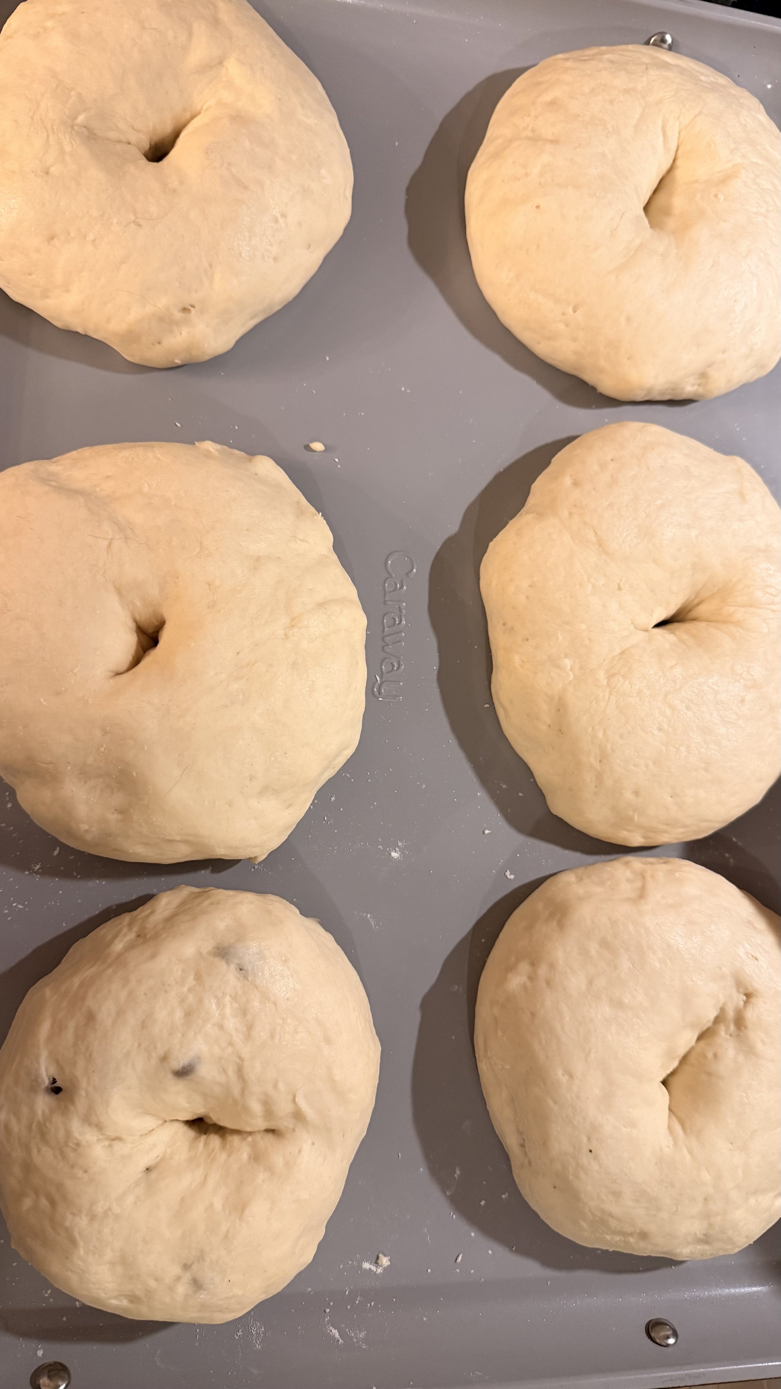 Roll each piece of dough into balls, flatten down a bit, and poke a hole in the middle using your finger. Stretch hole to widen a bit. When all bagels are shaped, cover with a tea towel and place dough in a warm spot for 30-60 minutes or until puffy. I like to place them on a baking sheet with parchment paper.