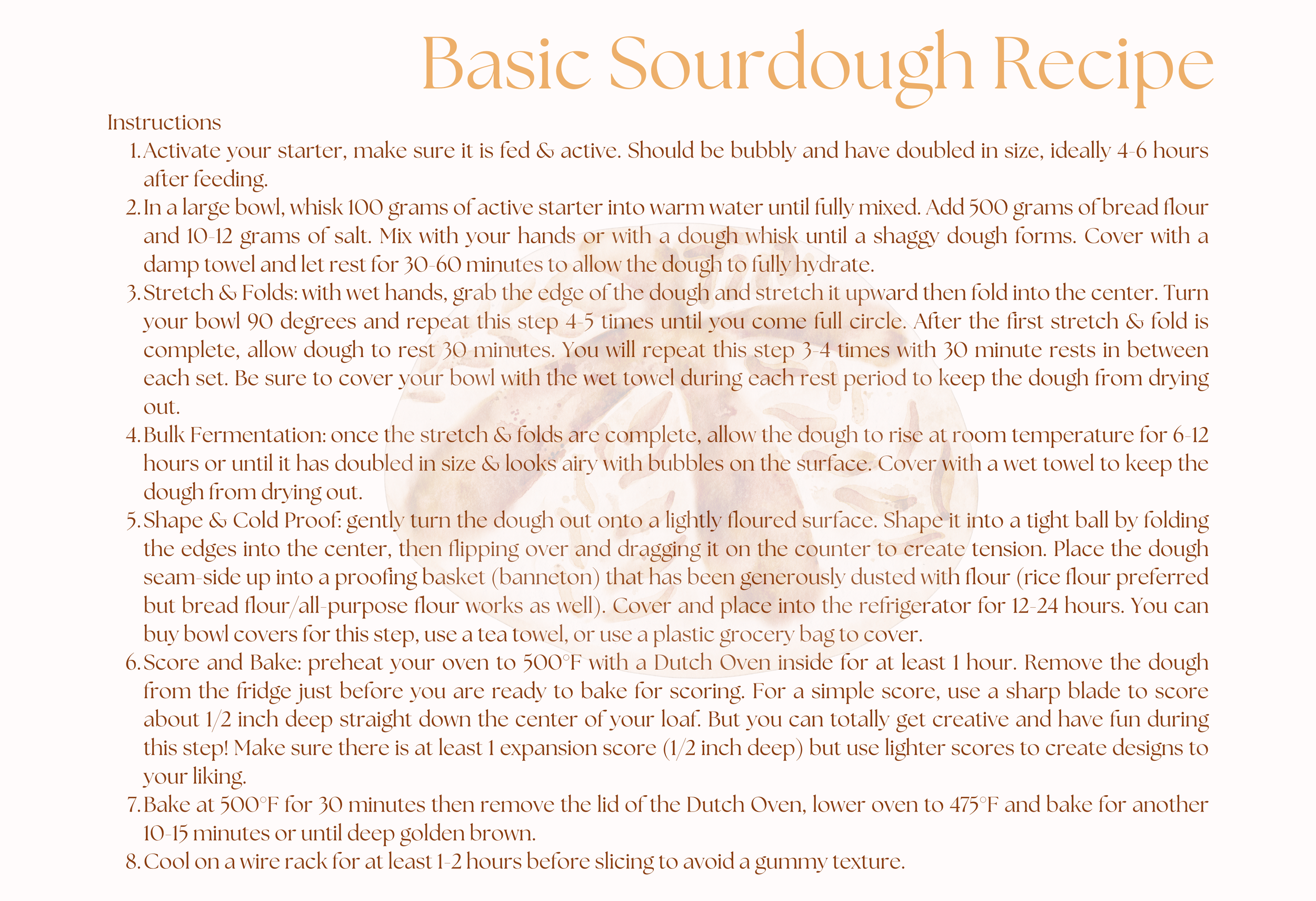 If you want to add inclusions (ingredients mixed into your loaf like cheese, veggies, etc), you will want to do so during Shape step. Stretch the dough on the floured surface, add your inclusion ingredients, and fold the dough into itself. Then continue by following the instructions for shaping it into a ball. Be careful not to rip your dough by creating too much tension.